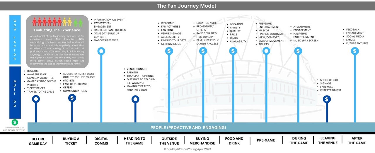 Mark Bradley, co-author of the Fan Journey model said, “It is fascinating and revealing exercise to scope out the key touch points in the Fan Journey and then grade them in terms of their positive or negative impact on the overall experience. We believe it has never been more important to ensure the experiences clubs or events offer provide the highest possible levels of value for the fan”.